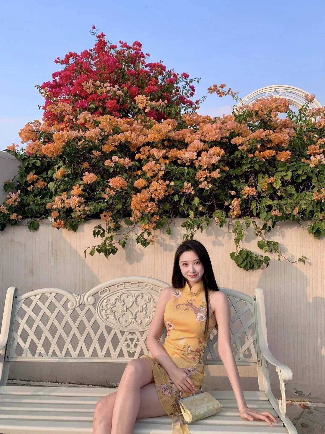 侧身坐在花墙旁的长椅上,双腿轻轻交叠,一只手向后撑在长椅上,身体微微倾斜,抬头看向镜头,脸上带着微笑。花墙拍照这样摆,大方又有气质,拍出来好看又漂亮,轻松出片,氛围感拉满。