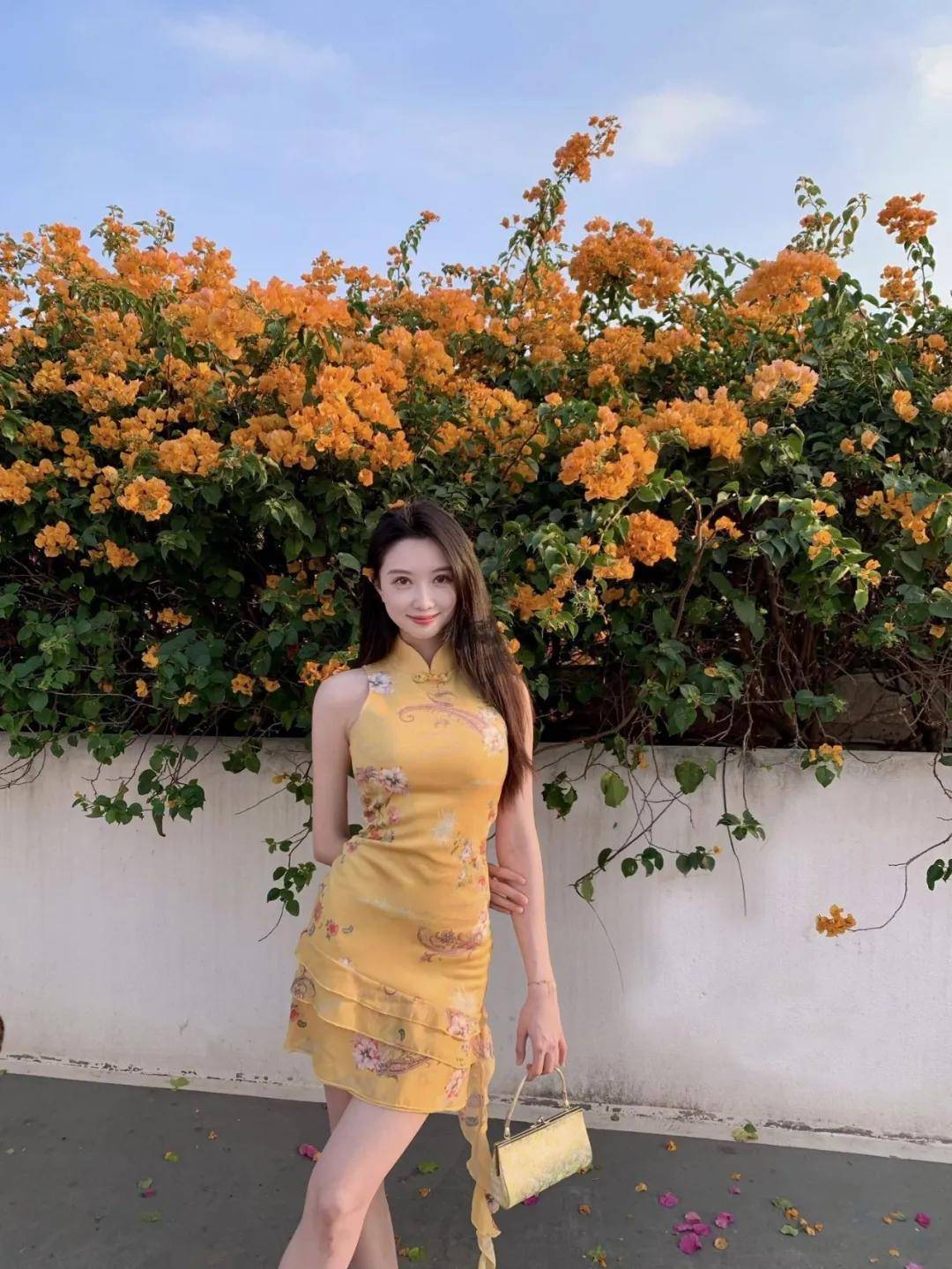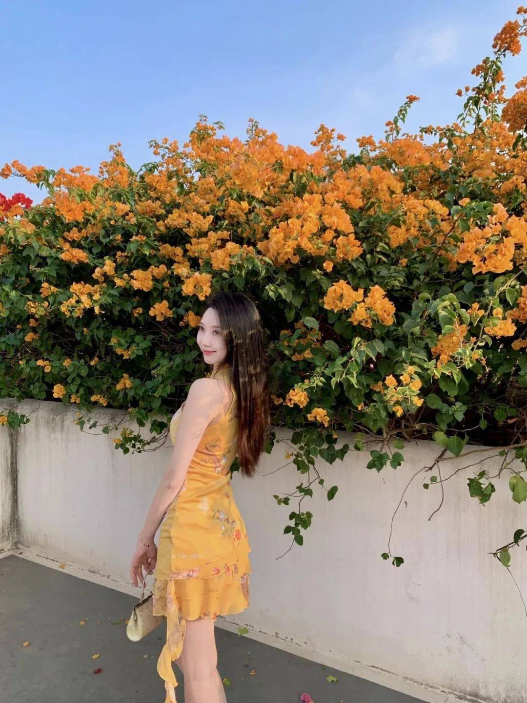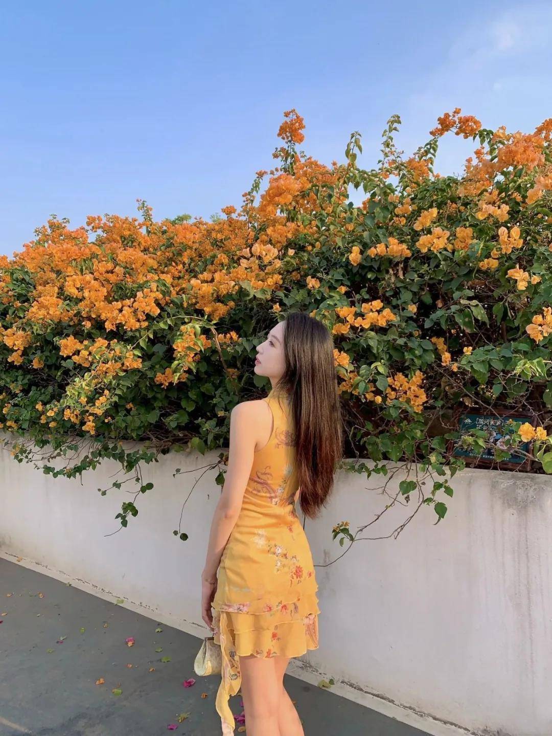 侧背对着花墙站立,一只手提着包包,身体放松,慢慢仰头,自然看向远方,不用刻意摆表情,自带温柔感。花墙拍照这样摆,大方又自然,拍出来好看又漂亮,轻松出片,很有画面感。