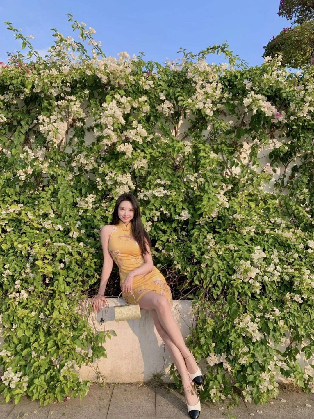交叠双腿坐在围栏上,腰背挺直但不紧绷,双手自然搭在腿上,姿势大方得体,抬头看向镜头,脸上带着温柔的笑。花墙拍照用这个姿势,优雅又好看,拍出来漂亮又出片,很适合喜欢温柔风的人。
